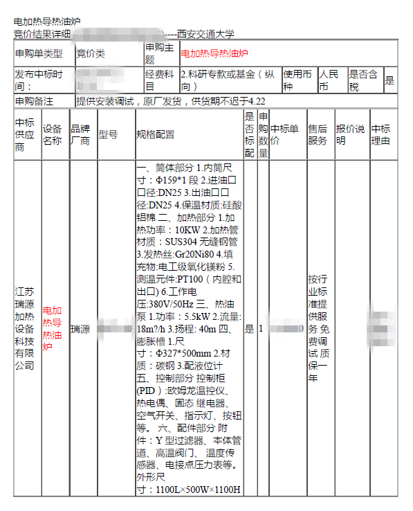 瑞源电加热导热油炉中标西安交通大学项目
